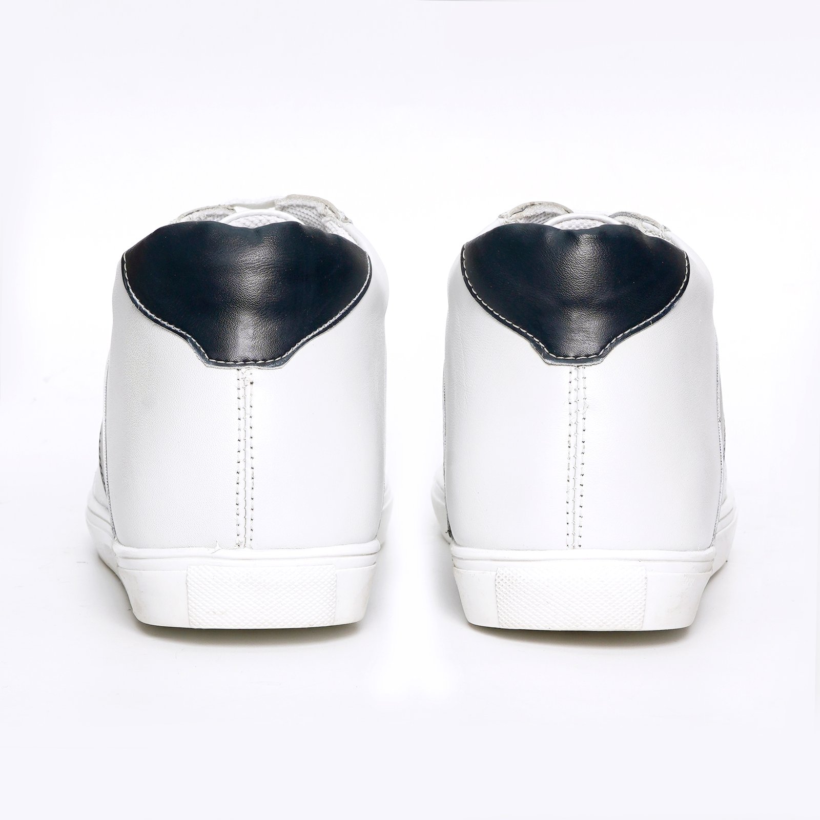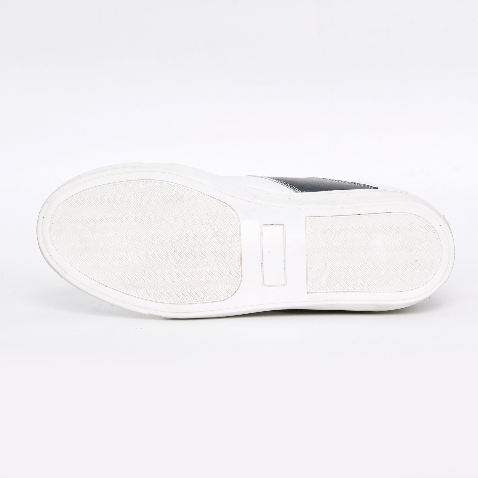 2. Navy Blue Stripe Design: The navy blue stripe adds a pop of colour and visual interest to the white sneakers. Stripes are a popular design element in casual and sporty footwear.