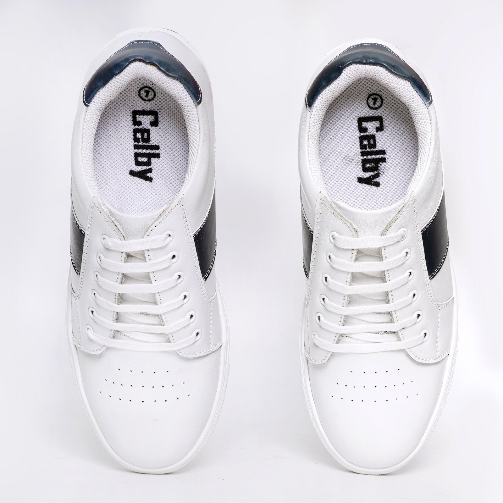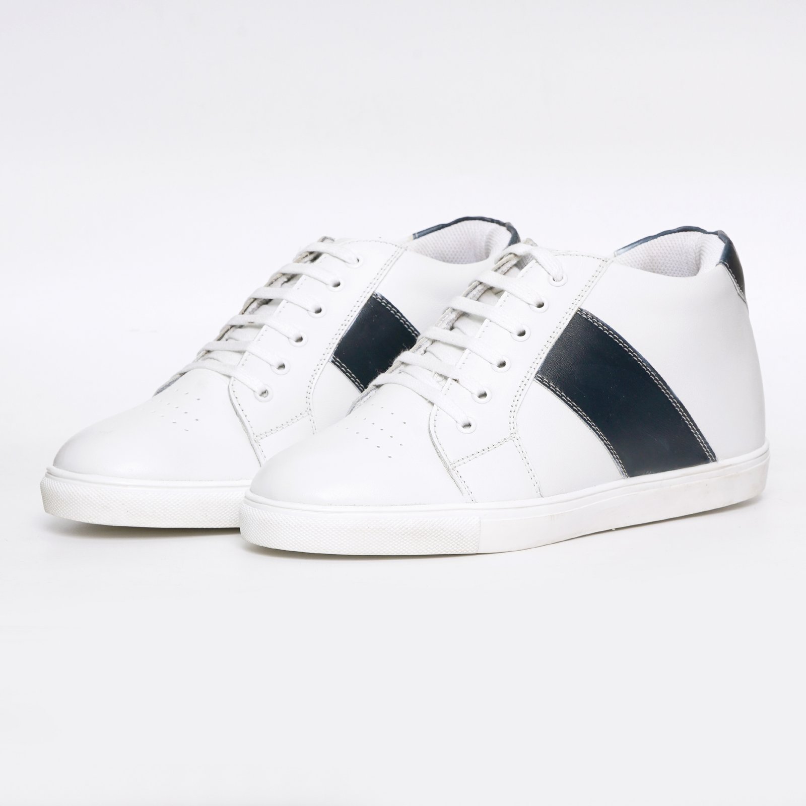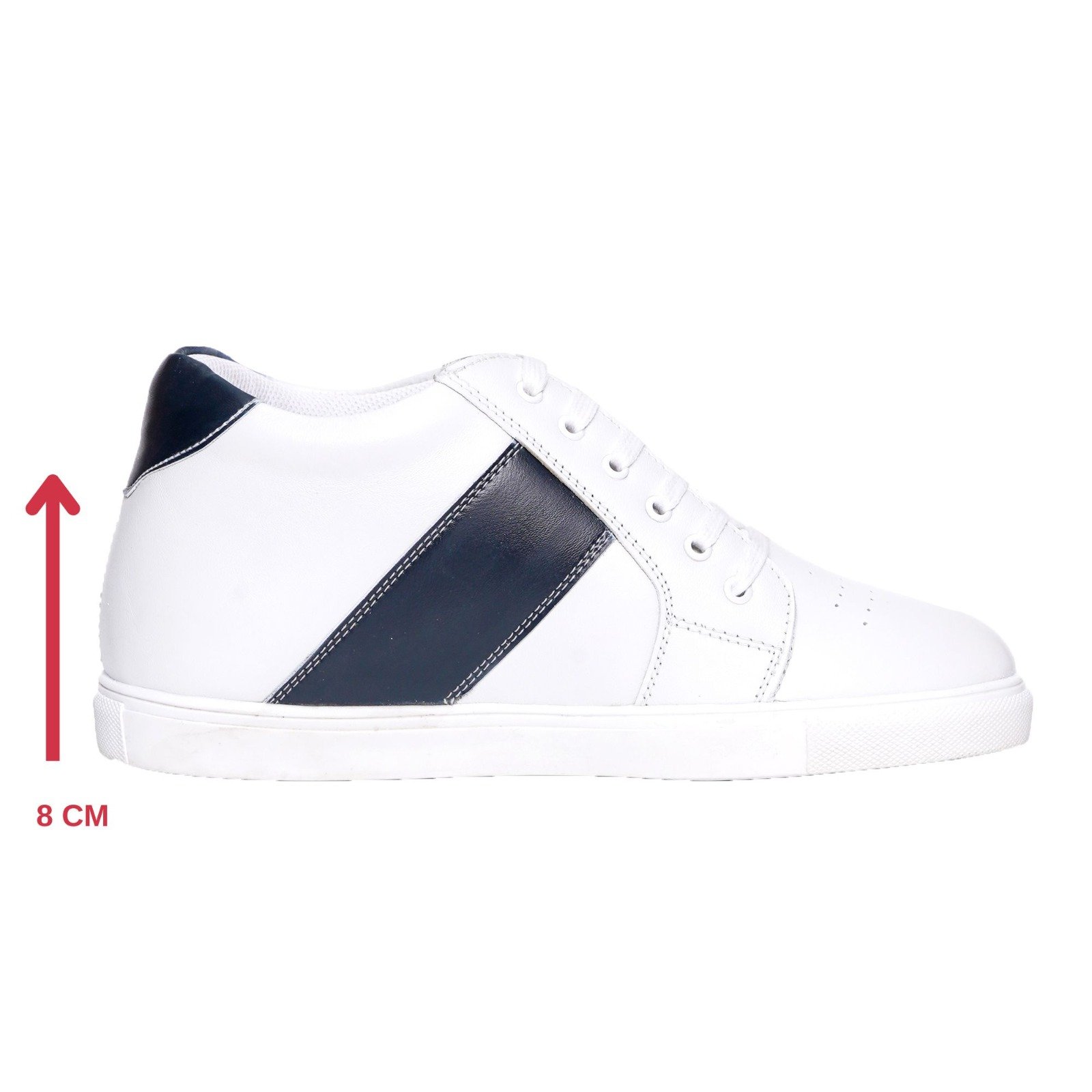 White sneakers with a navy blue stripe and a hidden heel of 8 cm offer a sporty and stylish option with a discreet height boost. Here’s a breakdown of the key features: